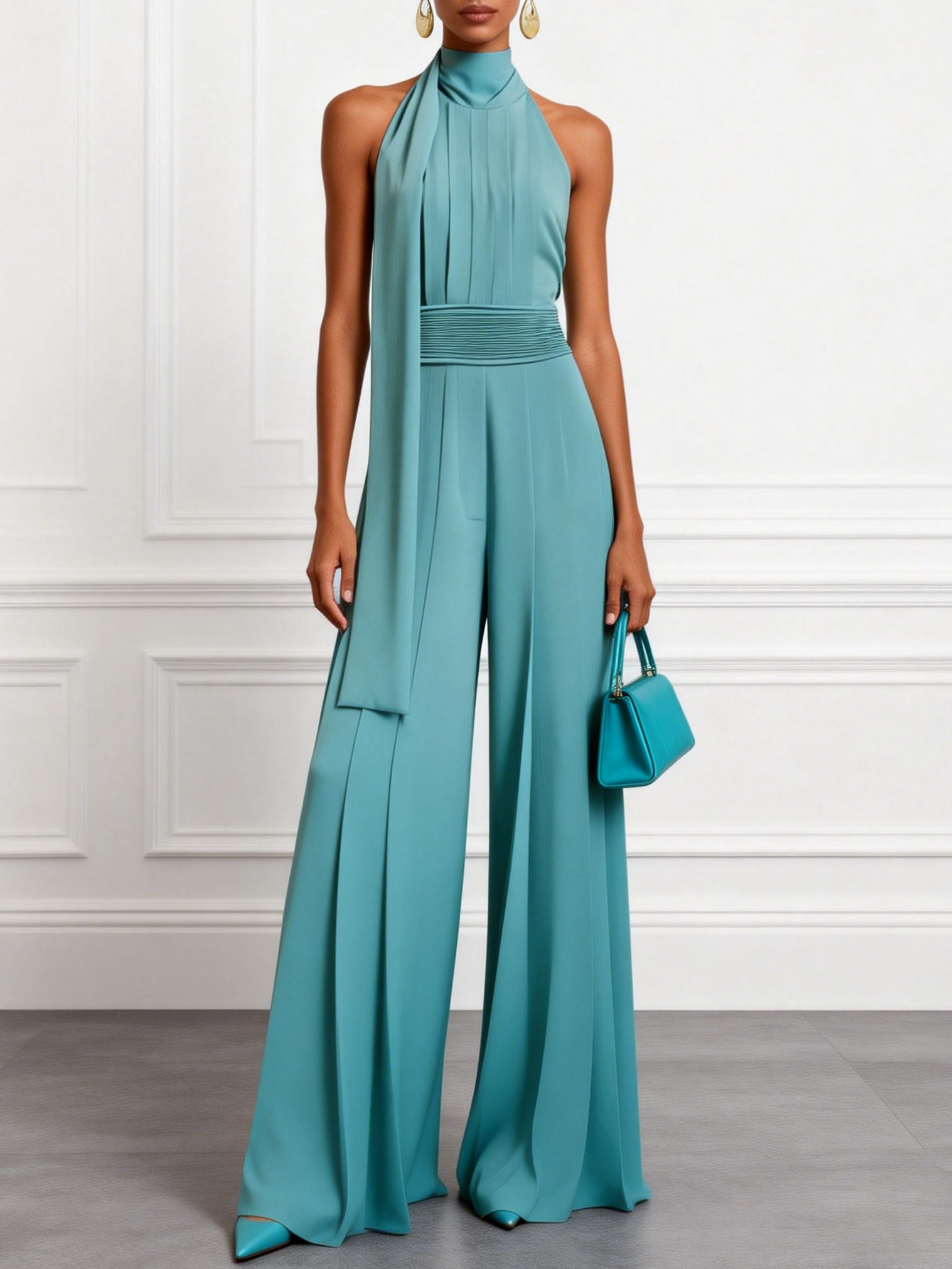 Blue Ruched Halter Mock Neck Sleeveless Dressy Jumpsuit