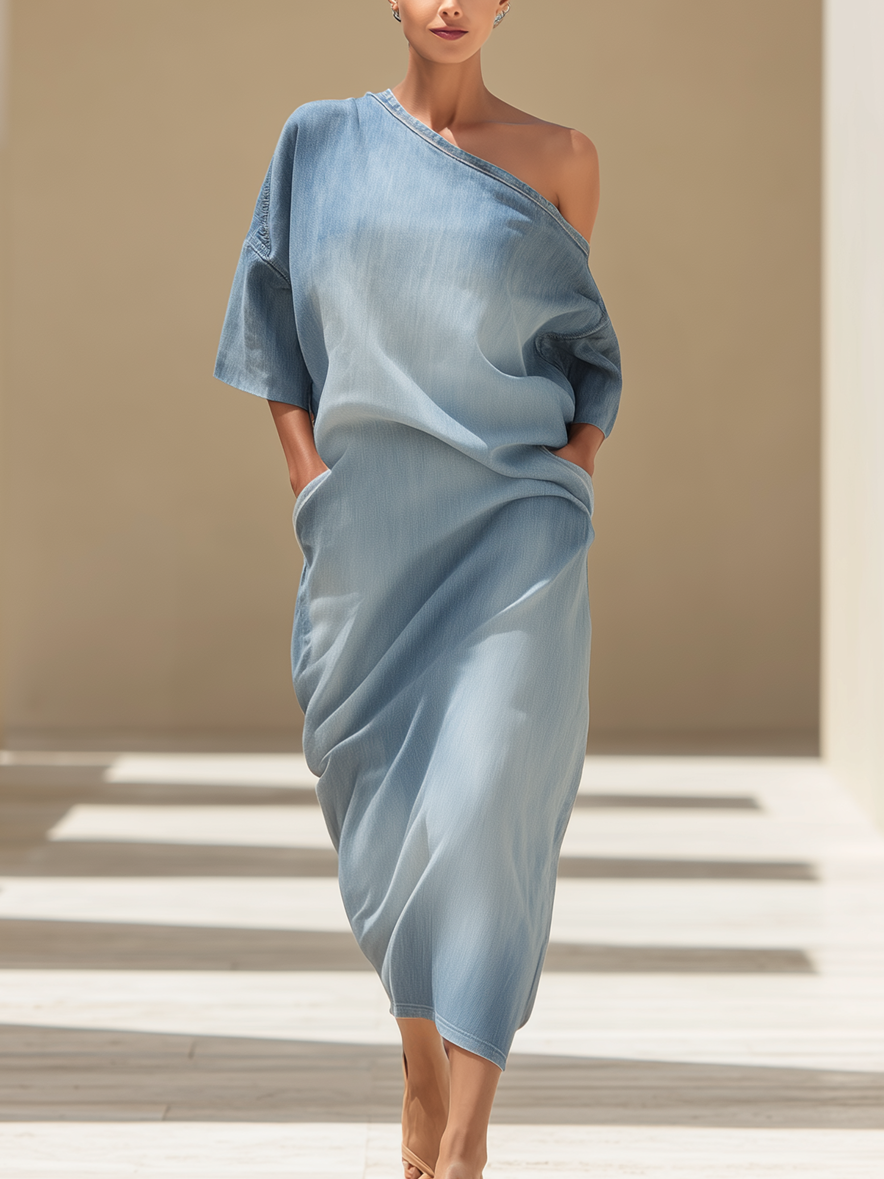 This light blue ombre denim maxi dress redefines casual sophistication. The asymmetric one-shoulder neckline and oversized draped silhouette create a relaxed, effortless look, while the ombre wash adds a modern gradient effect. The side pockets offer practicality, and the lightweight denim ensures breathability, making it the perfect one-piece solution for chic, easy dressing in any warm-weather setting.