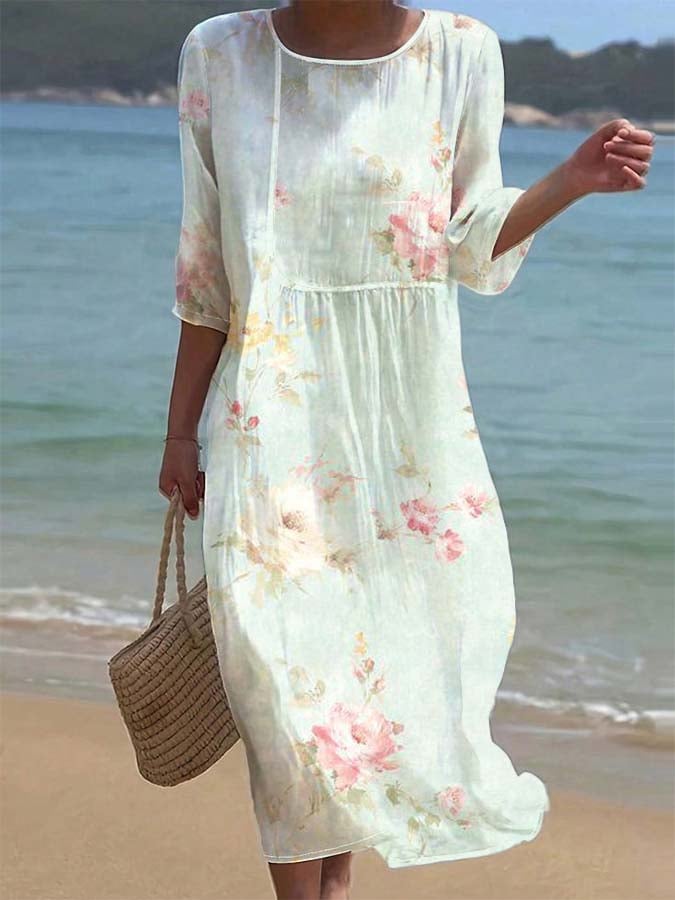Women's Casual Round Neck Mid Sleeve Print Cotton and Linen Dress
