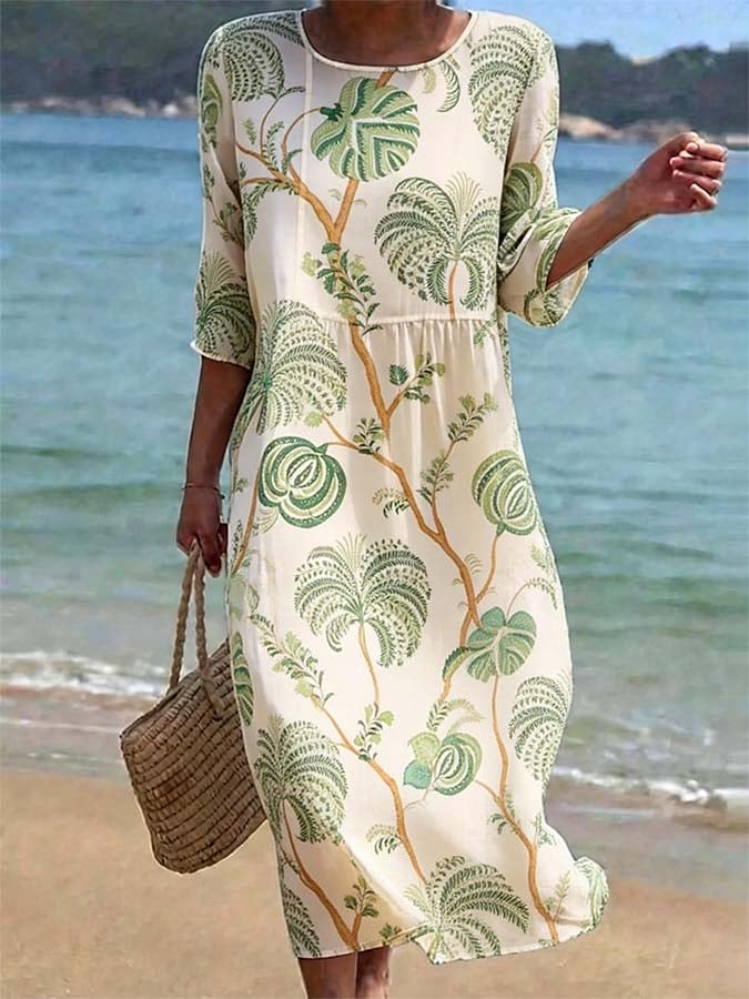 Women's Casual Round Neck Mid Sleeve Print Cotton and Linen Dress