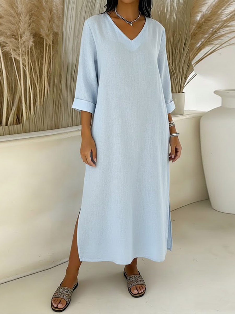 Women's Solid Color V-neck Long-sleeved Casual Loose A-line Cotton And Linen Dress.