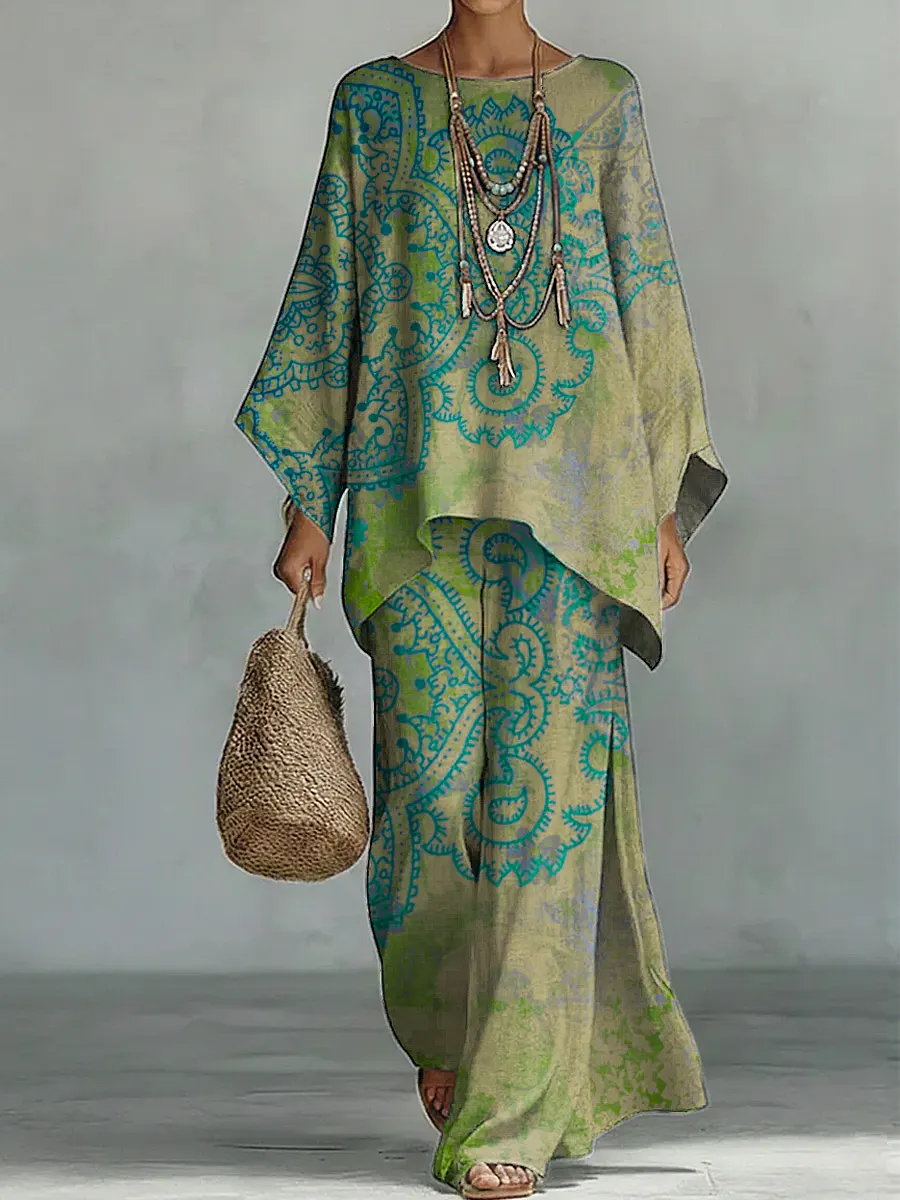 Women's Vintage Floral Art Comfortable Loose Cotton Linen Wide-leg Pants Two-piece Set